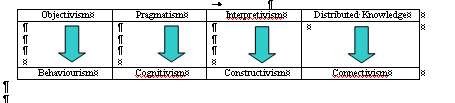 Instead of modelling our knowledge structures as hierarchical or flat, confined belief spaces, the view of networks enables the existence of contrasting elements selected on the intent of a particular research or learning activities. If the silos of traditional knowledge classification schemes are more fluid, perhaps the individual elements of different theories can be adopted, as required, to solve more nuances of learning problems. When the theory does not require adoption in its fullest (i.e. interpretivism or positivism), the task of seeking knowledge becomes more salient. (p. 29)